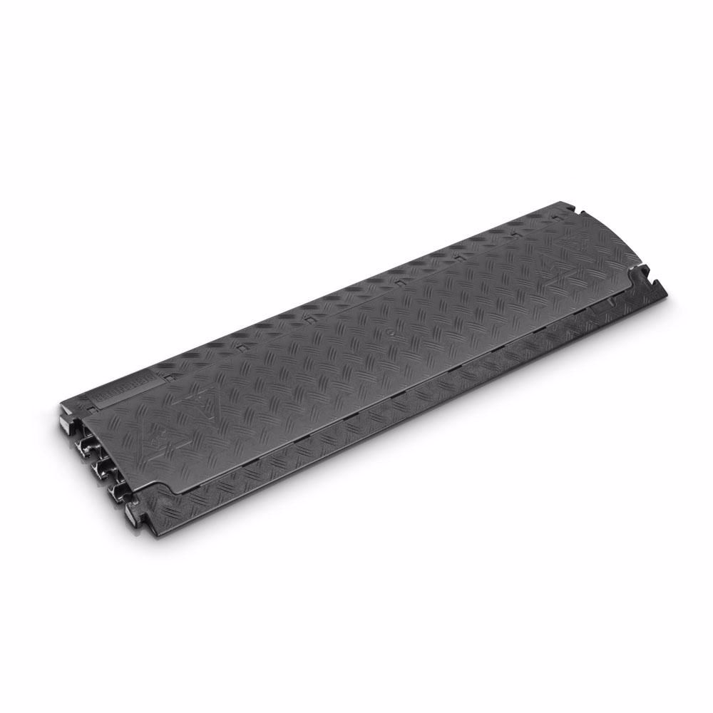 Defender Nano BLK Cable Protector 6-channel with black Cap ?especially flat, non-slip cable protector made of black, recyclable polyurethane, wheelchair-compatable ?black polyethylenelid with secure closure ?patented, self-cleaning lid hinge ?6 channels 17 x 18 mm ?load bearing capacity approx. 2t / 20 x 20 cm ?lire resistance class B2 (DIN 4102), DEKRA-certified (DIN 31000, EN 61537) ?resistant to oil, acids, solvents, and petrol ?limensions 100 x 28 x 3.2 cm; Weight 4.37 kg ?reliable protection for cables and personnel for indoor and outdoor use ?not suitable for vehicular traffic ?end ramps for secure cable inlet and exit as accessories