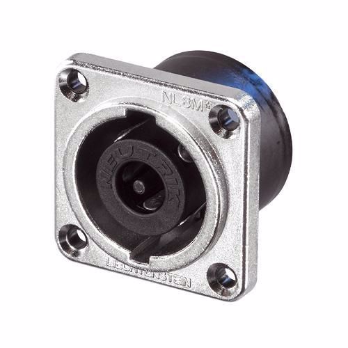 8 pole chassis connector, nickel metal square G-size flange, countersunk thru holes, 3/16" flat tabs The speakON panel mount connectors are the standard chassis connectors for loudspeaker / amplifier interconnections. They feature a unique metal locking system, making contact only once fully locked. The speakON receptacles are robust, versatile and easy to terminate. Features & Benefits •C urrent rating 30 A rms •Glass reinforced materials make it extremely robust and dependable •Precise keyway for secure mating •Accurate twist lock latching system •Metal flange •Airtight design - optimized for speaker applications