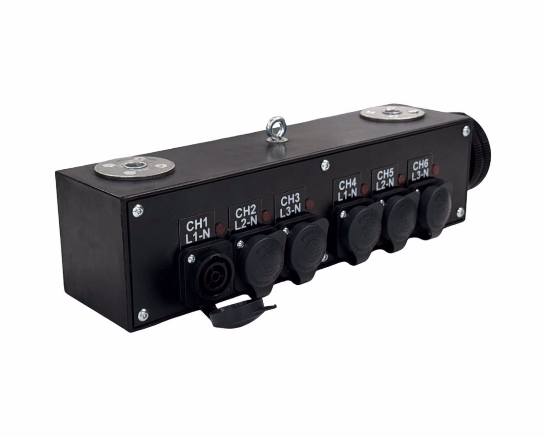 Outgoing: 6 x powerCON TRUe1 TOP 16A 3p 230V IP65 appliance outlet with sealing cover IP65 (CH1 / CH6).