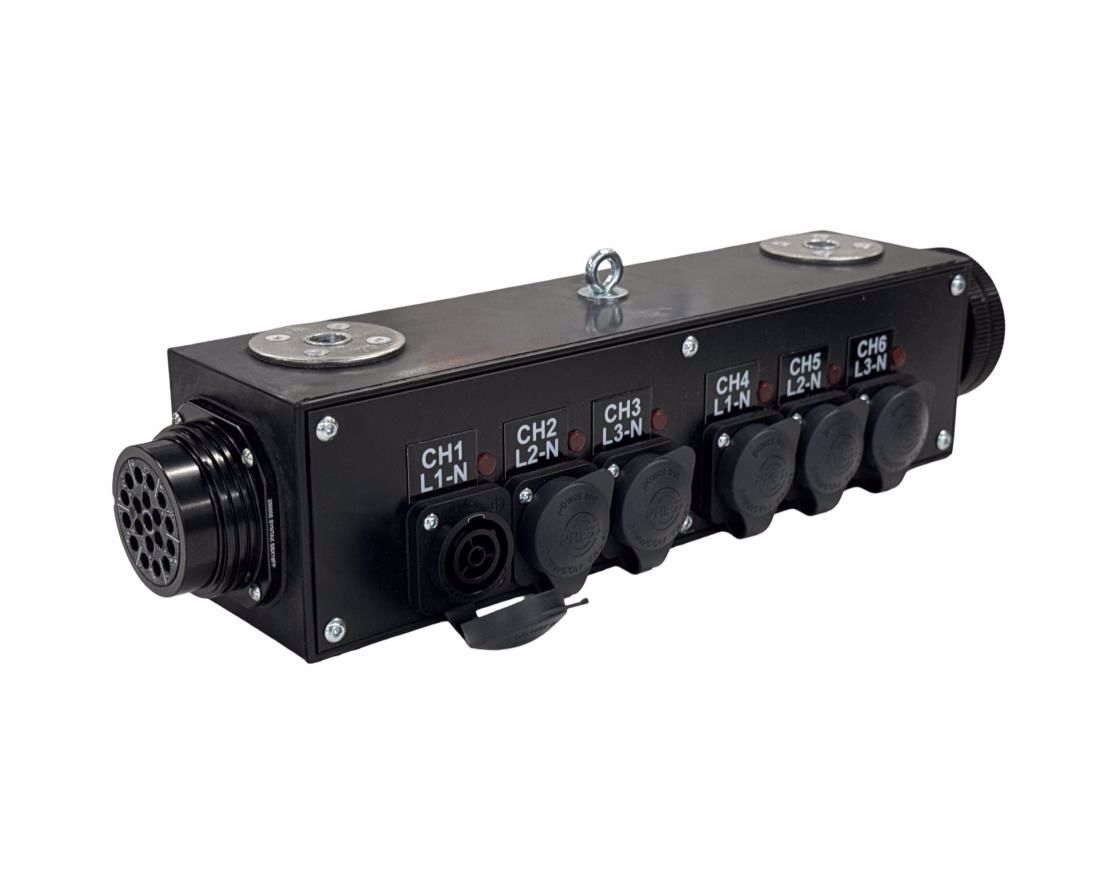 Outgoing: 6 x powerCON TRUe1 TOP 16A 3p 230V IP65 appliance outlet with sealing cover IP65 (CH1 / CH6).